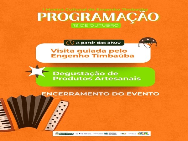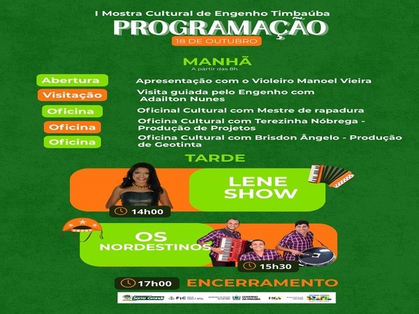 Secretaria Municipal de Cultura de Serra Grande divulga programação da I Mostra Cultural do Engenho Timbaúba!